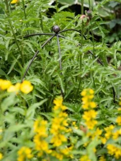 For any avid gardener or plant lover, finding attractive vertical space for your climbing vines, flowers, vegetables, or runners can be an opportunity to add a striking decorative element to the garden. The Asian-inspired Samsara Trellis has three simple rings representing the Buddhist belief in the cycle of reincarnation- life, death, and rebirth. The uppermost ring has a small hook for hanging a bell or gong, lantern or birdfeeder. Free-standing when spiked legs are pushed directly into the ground, this trellis may also be stabilized with Trellis Wall Bracket (sold seperately). Made of wrought iron with a smooth black powder coated finish for maximum weather resistance.