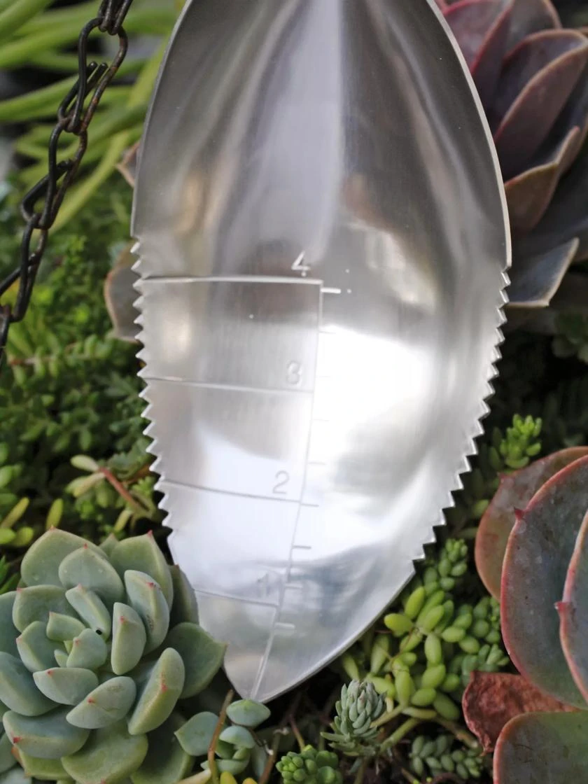 Six-in-one tool does the work of a cultivator, trowel, weeder, scoop, hori knife, and bulb digger. Sharp, serrated edges easily cut through roots and vines. The pointed tip breaks through packed soil and is handy for making trenches and furrows for planting seeds. Durable stainless steel blade; easy-grip silicone handle. The spoon-shaped scoop is etched in increments of 1″ up to 4″ so you can determine the proper planting depth for seeds and bulbs.