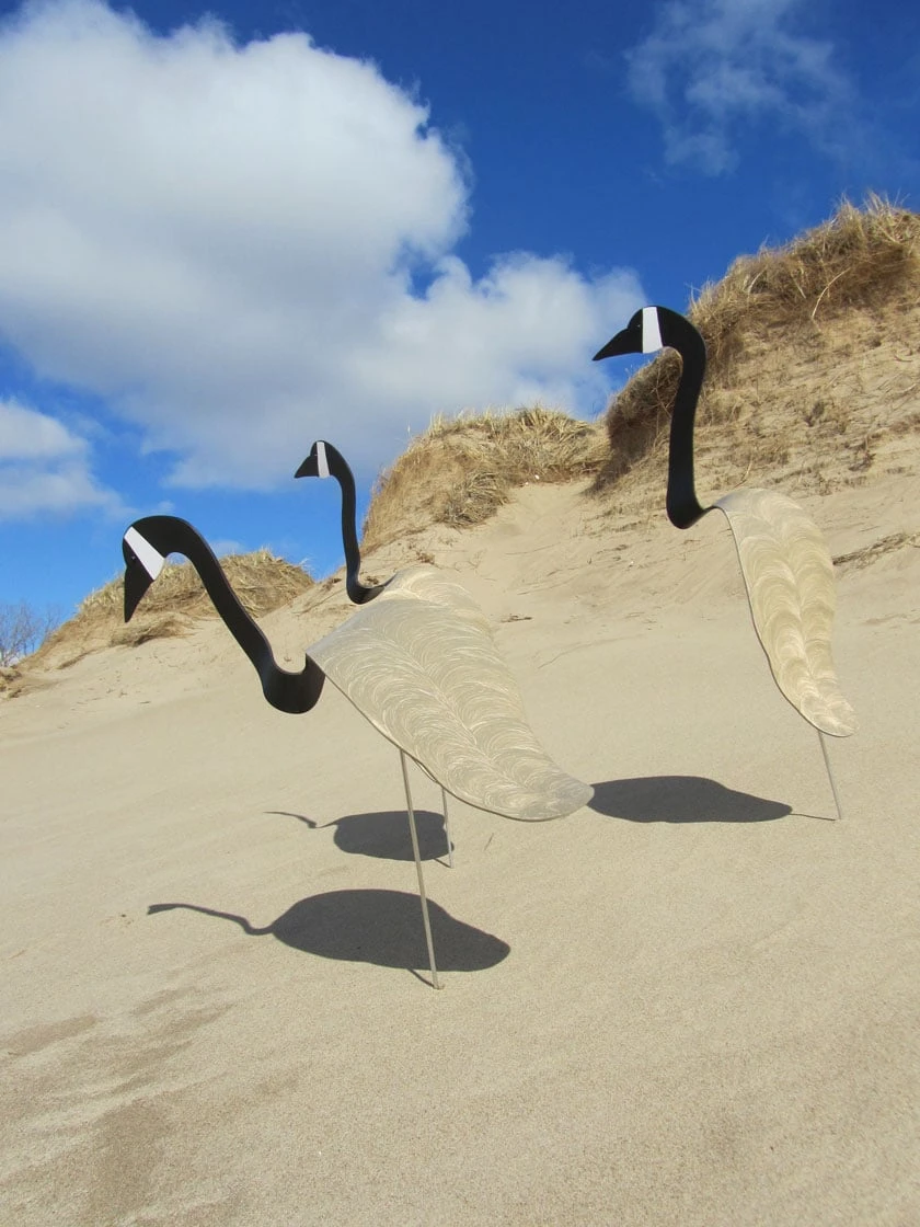 Our Canada Goose dances on the slightest breeze. Our special hinge allows it to swivel and dip atop a 35″ galvanized stake. Made from UV-resistant PVC, entirely hand painted & hand formed, it is durable in day-to-day weather. Simply lift off the stake to take in during severe weather or extreme temperatures. Made in the USA.