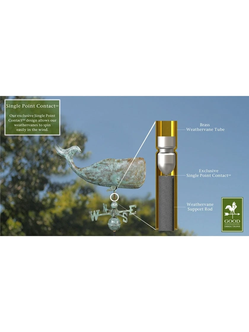 Thar he blows in the breeze! The largest mammal that ever lived, this whale design, circa 1860, is ready to adorn the rooftop of your home, garage, cupola, barn or gazebo. For over 35 years Good Directions pure copper weathervanes have been unsurpassed in style, quality, and durability ā perfect for the house-proud homeowner. Weathervanes are easy-to-assemble and install. Includes an assembly rod, solid brass 18″L directionals, and copper globes. A 401AL Roof Mount is recommended to mount your weathervane to your rooftop, sold separately. The assembled size of this weathervane is 37āL x 34″H x 18″W. The figure-only size is 37″L x 16″H x 4″W. The beautiful Blue Verde? finish achieves the historic look of aged copper. Our exclusive Single Point Contact? design allows our weathervanes to spin easily in the wind. Bring The Joy of Outdoor Living? to your home with this heirloom-quality piece.